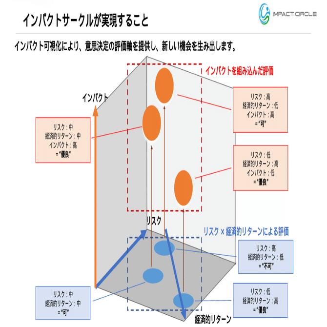 そのような課題に対して、インパクトを可視化することで、お金を流したり、経営の意思決定を行ったりすることが事業コンセプトの中心にあって。経済的リターンやリスクだけでなく、社会的なインパクトを見えるようにすることで、お金の意思決定だけでなく、経営や採用などさまざまな分野に反映されることを目指しています。