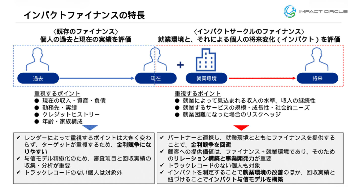 この事業の特徴は、単にローンやリースを提供するのではなく、就業環境とセットで提供するということ。従来の貸付評価のように過去の収入や信用情報といった実績だけを重視するのではなく、「ローンを提供することでドライバーの収入がどのように維持・向上されるか」といった“インパクト”を評価し、それに基づいてファイナンスをつけることがポイントになっています。