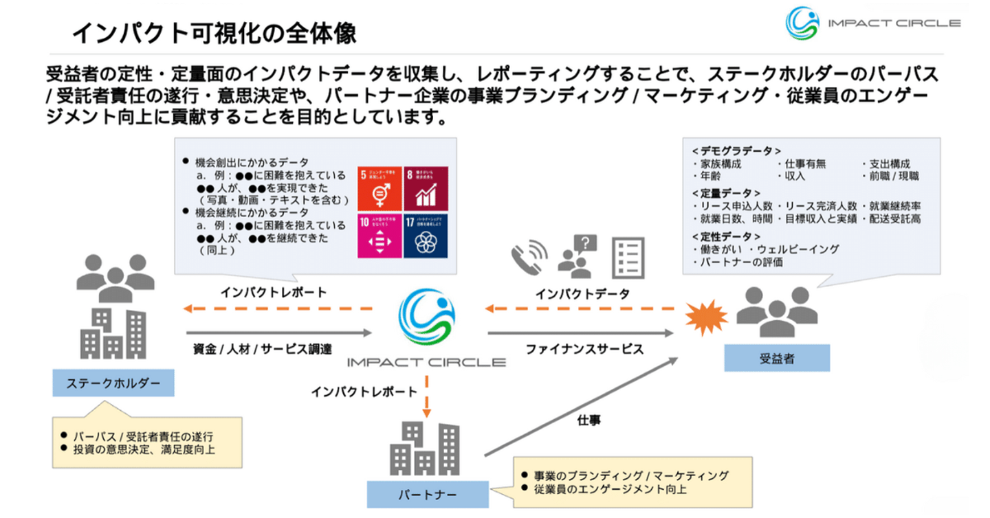 具体的には、ただ単にファイナンスを提供するだけでなく、そこで起きてるインパクトをデータとして収集し、それをレポート化することで、どのような行動変容があるのかを可視化しています。