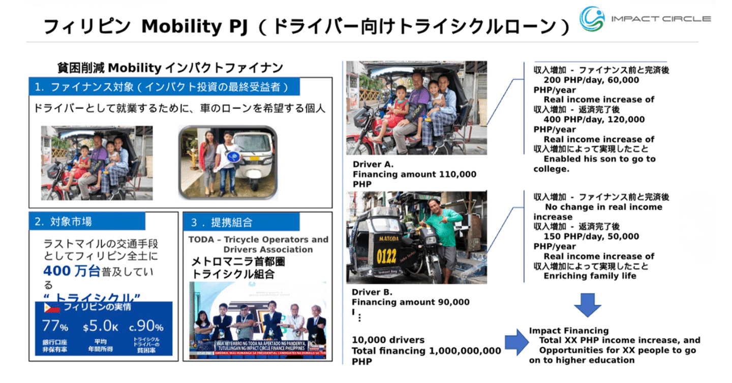 インパクトファイナンス事業とは、フィリピンと日本でドライバー(又は漁師)として就業を希望する個人向けに、働く手段として車両やボートのローンやリースを展開している事業です。