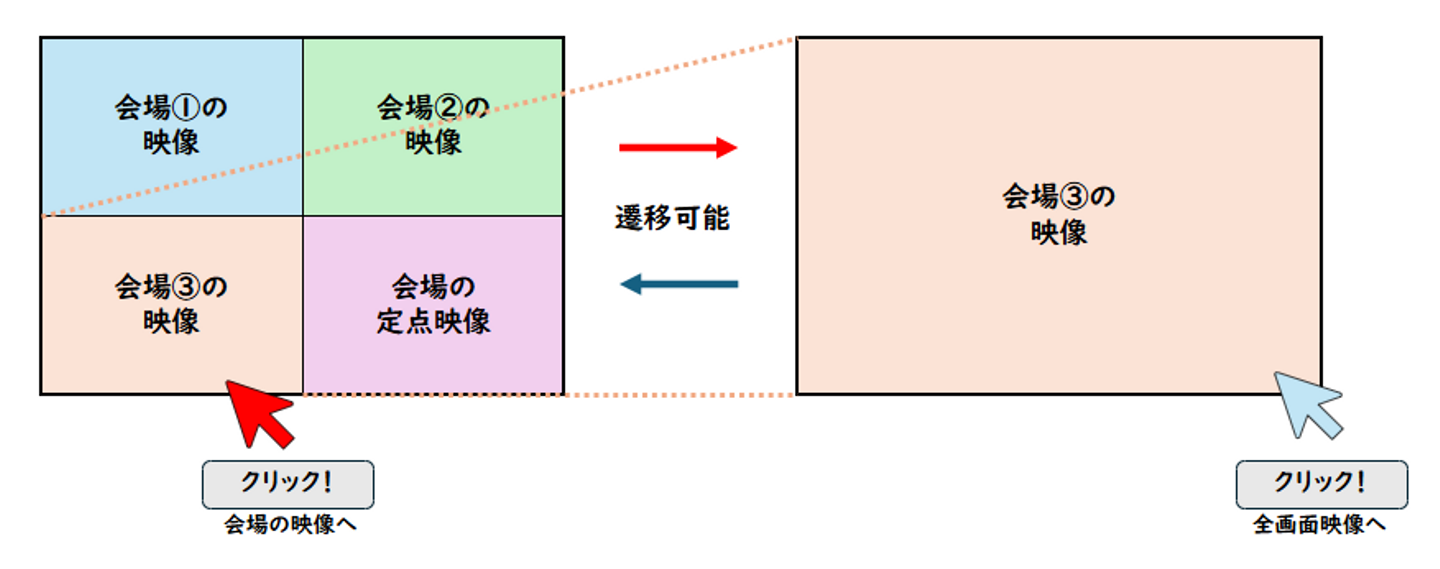 JANOG56では、視聴したい映像を自由に切り替えられる「マルチアングル配信」を実施予定です。マルチアングルいうことで、発表や議論が行われる3会場の映像と会場内の定点映像の4画面を合成し、視聴者は全体表示と、各映像の表示を自由に行き来することができます。