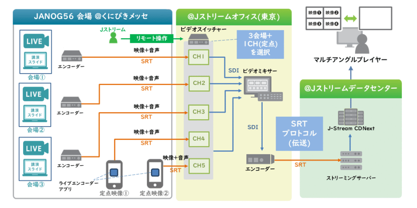 マルチアングル配信を実現するための技術仕様を紹介します。各会議場からの映像・音声データは各会場エンコーダーよりSRT(Secure Reliable Transport Protocol)を使ってJストリームの本社まで伝送します。