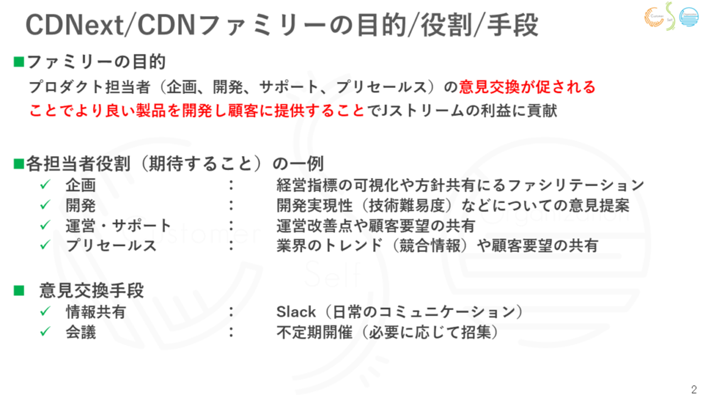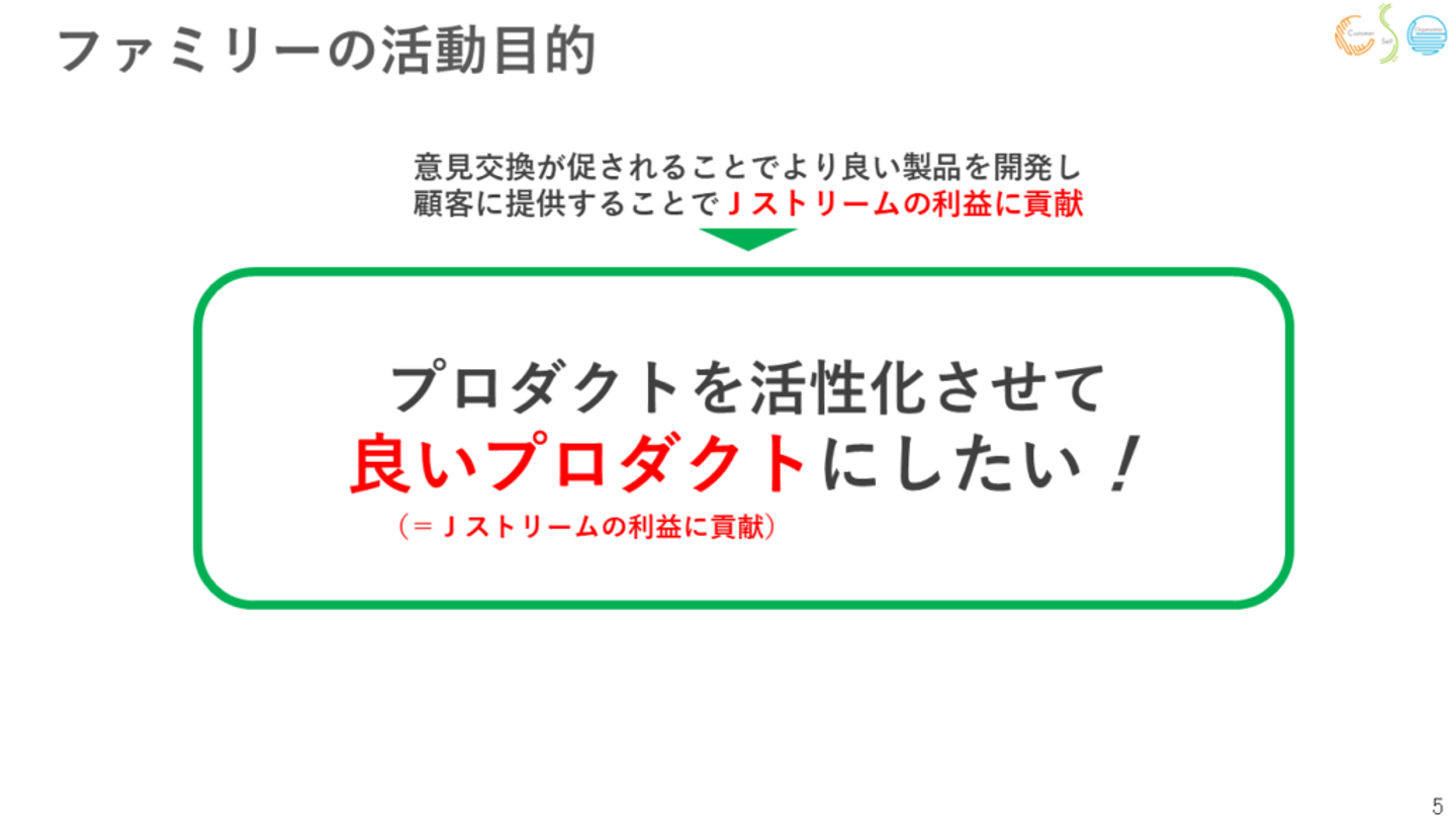 プロダクト担当者(企画、開発、サポート、プリセールス)の意見交換が促されることで、より良い製品を開発し顧客に提供することでJストリームの利益に貢献することを目的とした、部署横断の組織(ファミリー)です。