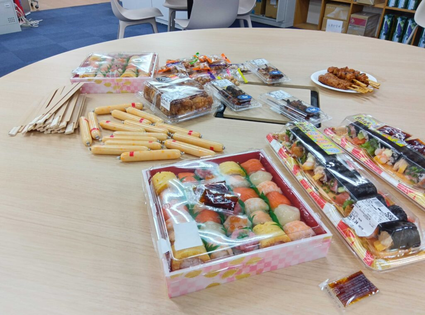 食事はお寿司やピザ、焼き鳥などバラエティ豊かなラインナップです。お酒はなんと、ビールとインフラ・アーキテクトの高見澤さんが差し入れてくれた日本酒のみというアグレッシブなチョイス!(ソフトドリンクはしっかり用意されていました笑)