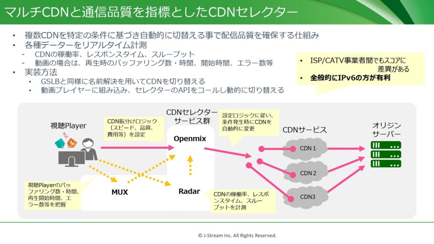 トラフィックが増えてくると、一つのCDNだけでは安定した配信が難しくなります。そこで最近注目されているのが、マルチCDNというソリューション。我々は、通信品質を考慮してCDNをセレクトしていく仕組みを持っています。