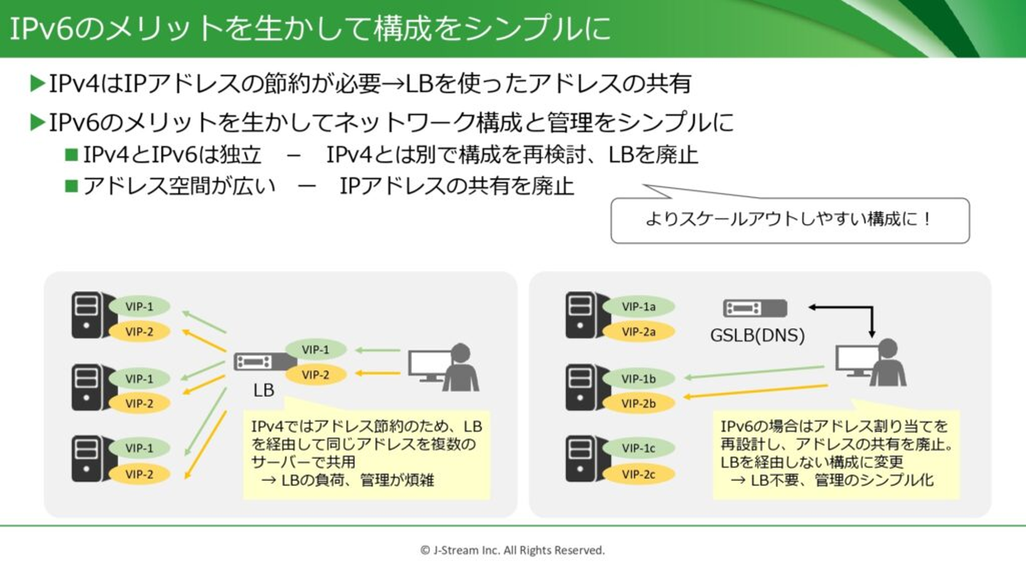 上記4つの中で最もポイントだったと思うのは、ロードバランサーとアプリケーションの部分です。よかった点、特に大きな成果だと思われる点としては、ロードバランサーの構成をシンプルにしたことです。IPv4の場合はアドレスの数がかなり限られているため、アドレス節約のためにアドレス共有やLBを使ったロードバランスが必須となります(図5-左図部分)。
