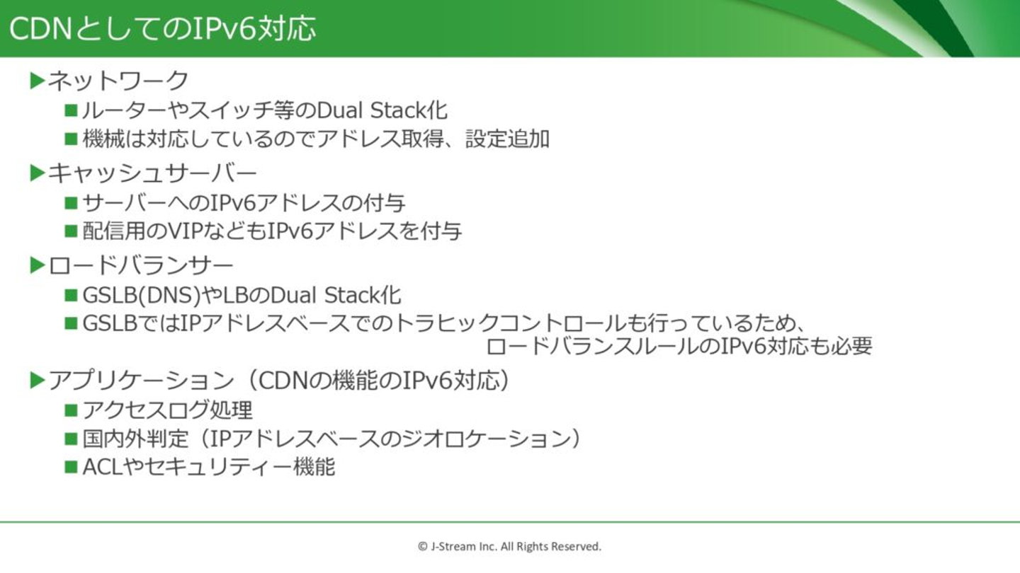 コンテンツ配信は、今後ますます盛り上がることが予想されます。コンテンツ配信IPv6時代におけるCDNについて、Jストリームでの差別化の方向性は、単純なコンテンツ配信だけは難しいと考えています。ジオコントロールやアドレスベースのACLをIPv6対応することでより高度なサービスができるよう注力していきたいと思います。