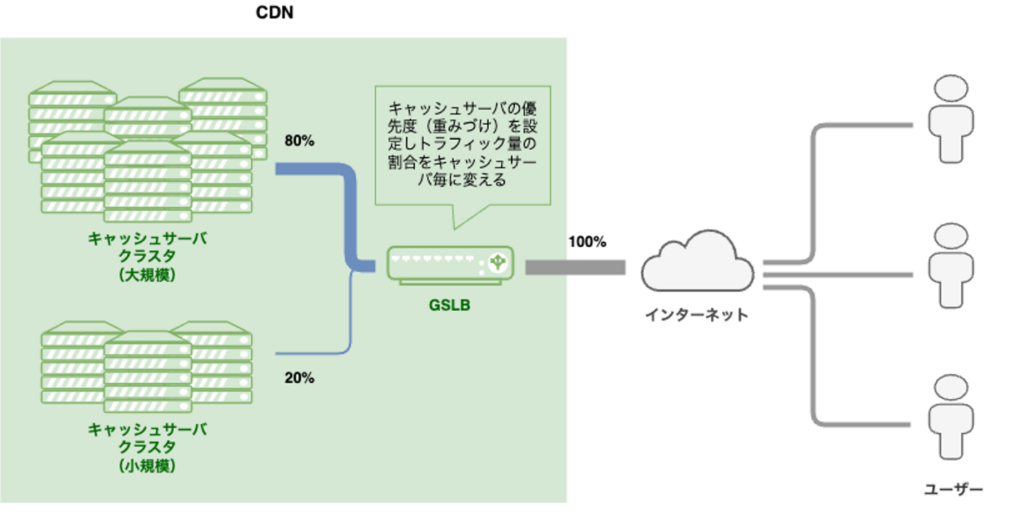 「重みづけラウンドロビンによる制御」は、キャッシュサーバクラスター単位でどのクラスタに優先してユーザーからのリクエストを流すかを制御する仕組みです。