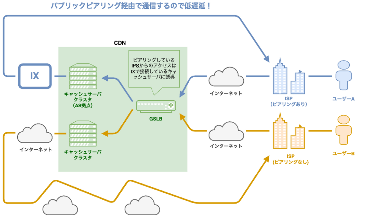 CDNでは「IPアドレスやAS番号による制御」を行うことで、ユーザーがリクエストした際のIPアドレスやAS番号の情報を利用して、ピアリングしているインターネットサービスプロバイダからの通信であれば、IXと接続している配信拠点のサーバーに誘導することで、より低遅延でデータを送信できるように制御しています。