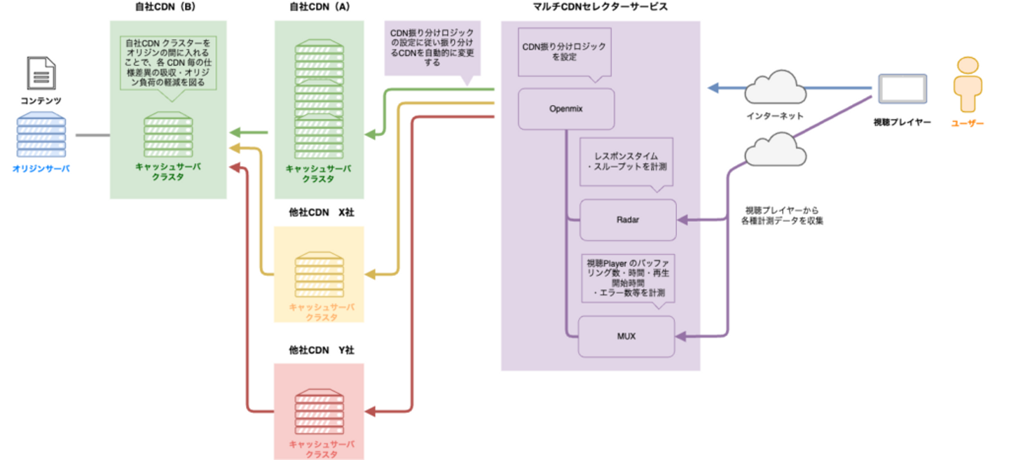 マルチCDNセレクターは「Radar」「Mux」「Openmix」といったサービスを連携して構築することができます。