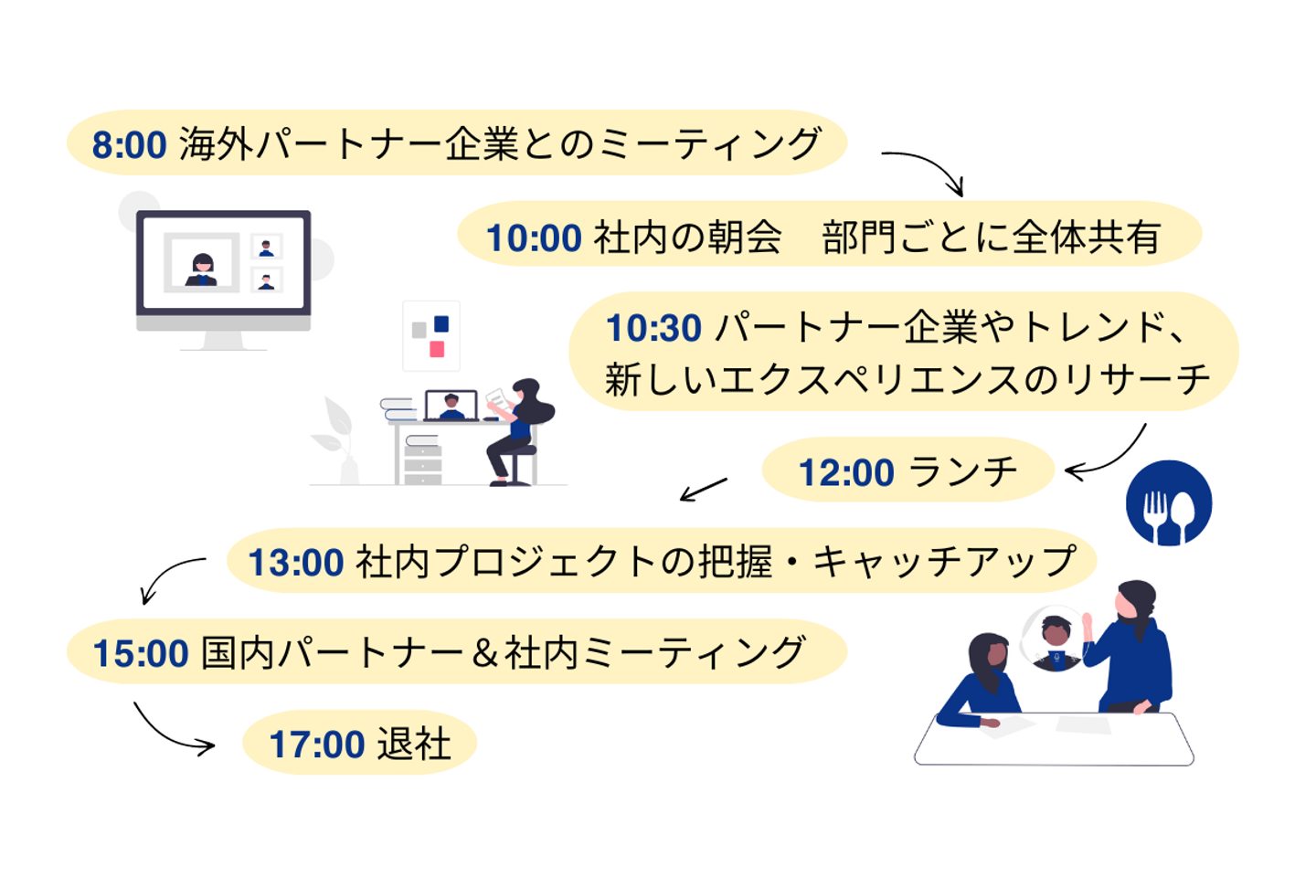 私はまだ入社したてですが、「プロダクトマーケティングマネージャー」として、弊社が携わっているエクスペリエンスのすべてのタイムラインを把握し、より多くのユーザーを集められるような戦略、企画そして実行を担当しています。
