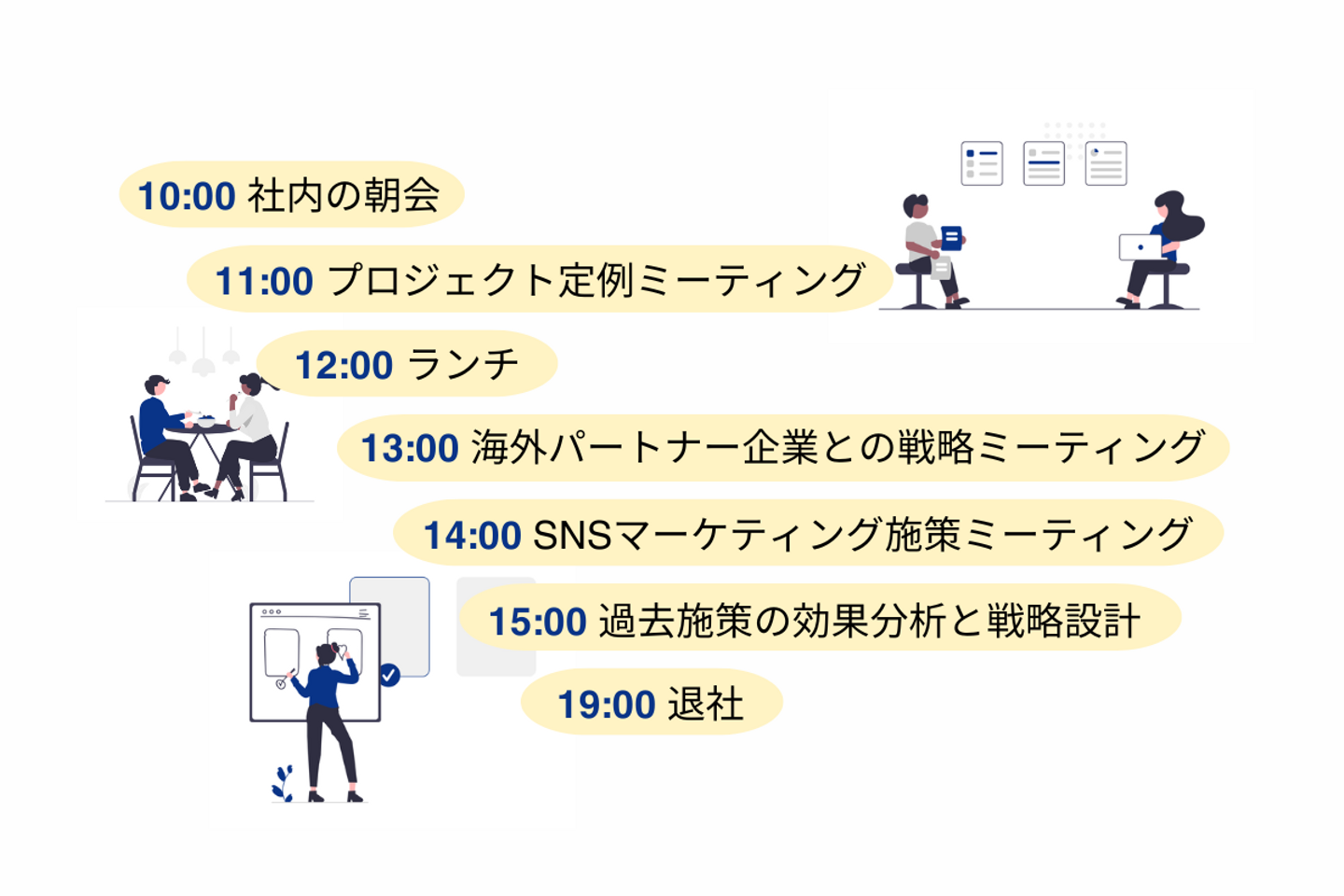 海外パートナーは時差があるので、基本的に朝や夜にミーティングすることが多いですね。日中は日本語でのキャッチアップをメインに行っています。これは朝早くの海外とのMTGがある日ですが、ない時は大体9時から18時くらいで働いていることが多いです。