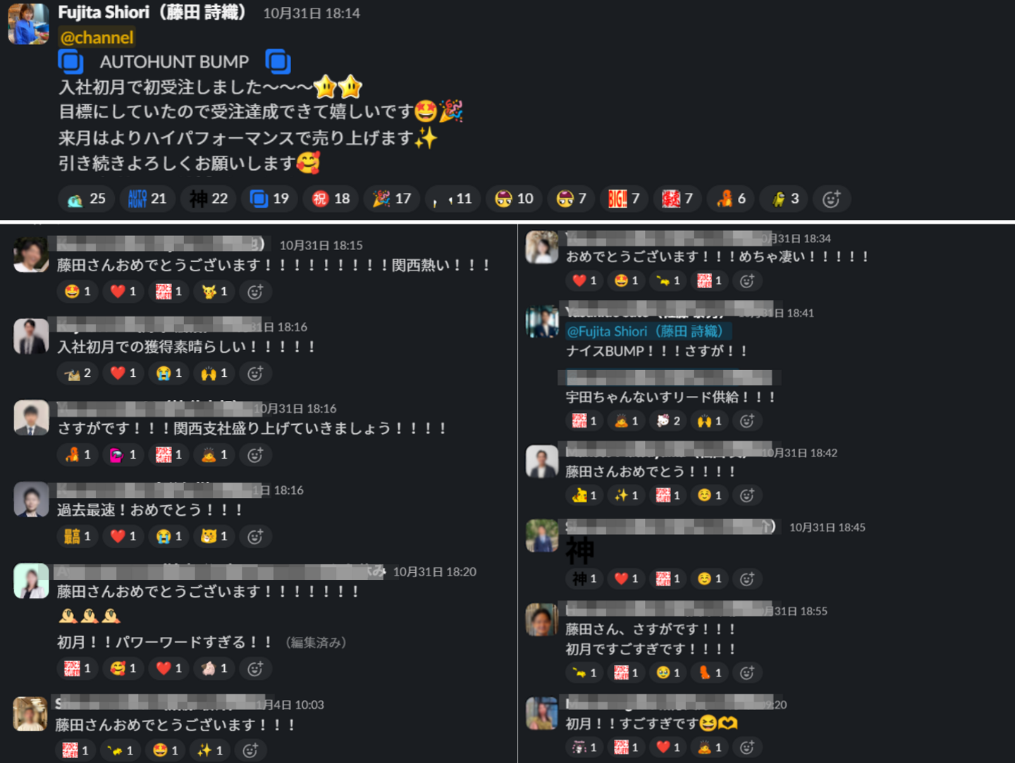 ※社内Slackでの様子。事業所の垣根を超えて、日々東京本社メンバーともコミュニケーションを取っています。