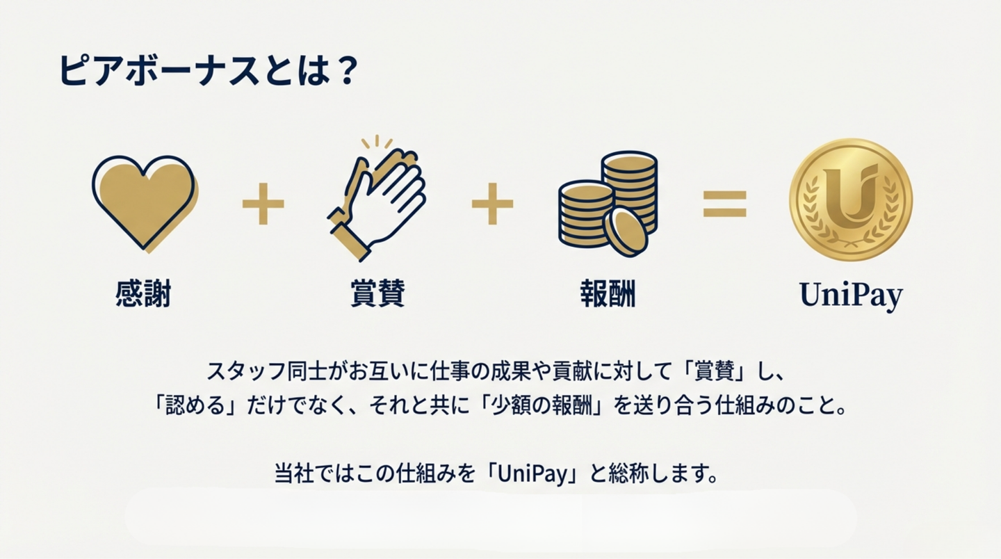 役職なんて関係なく、お互いの貢献を認め合う文化がこのUniPayを通じて根付いています。 誰かの小さな「気づき」が、誰かの「ボーナス」に変わる。