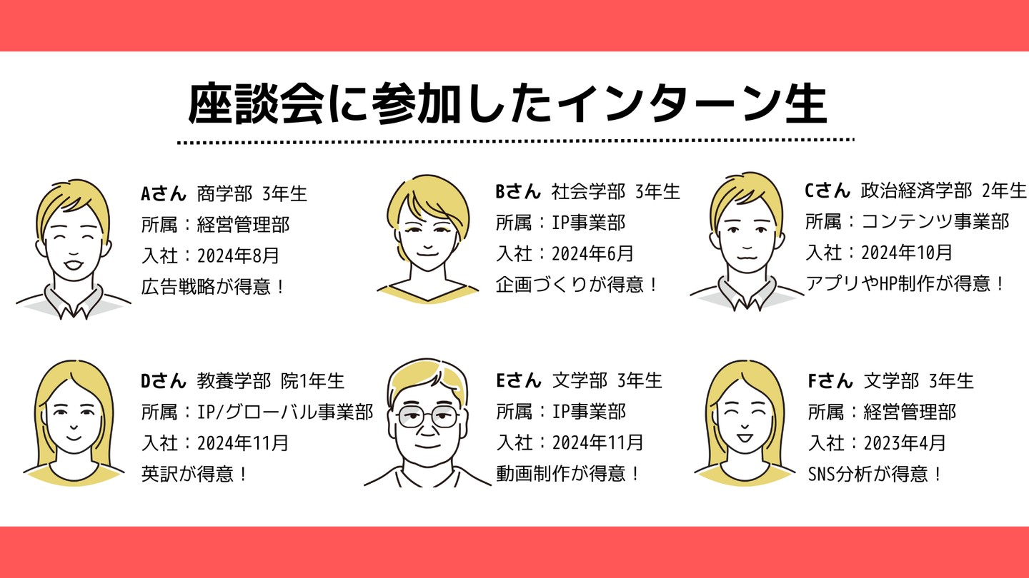今回は1年ぶりとなるインターン生座談会を開催しました!今回の参加者は6名😳💭
