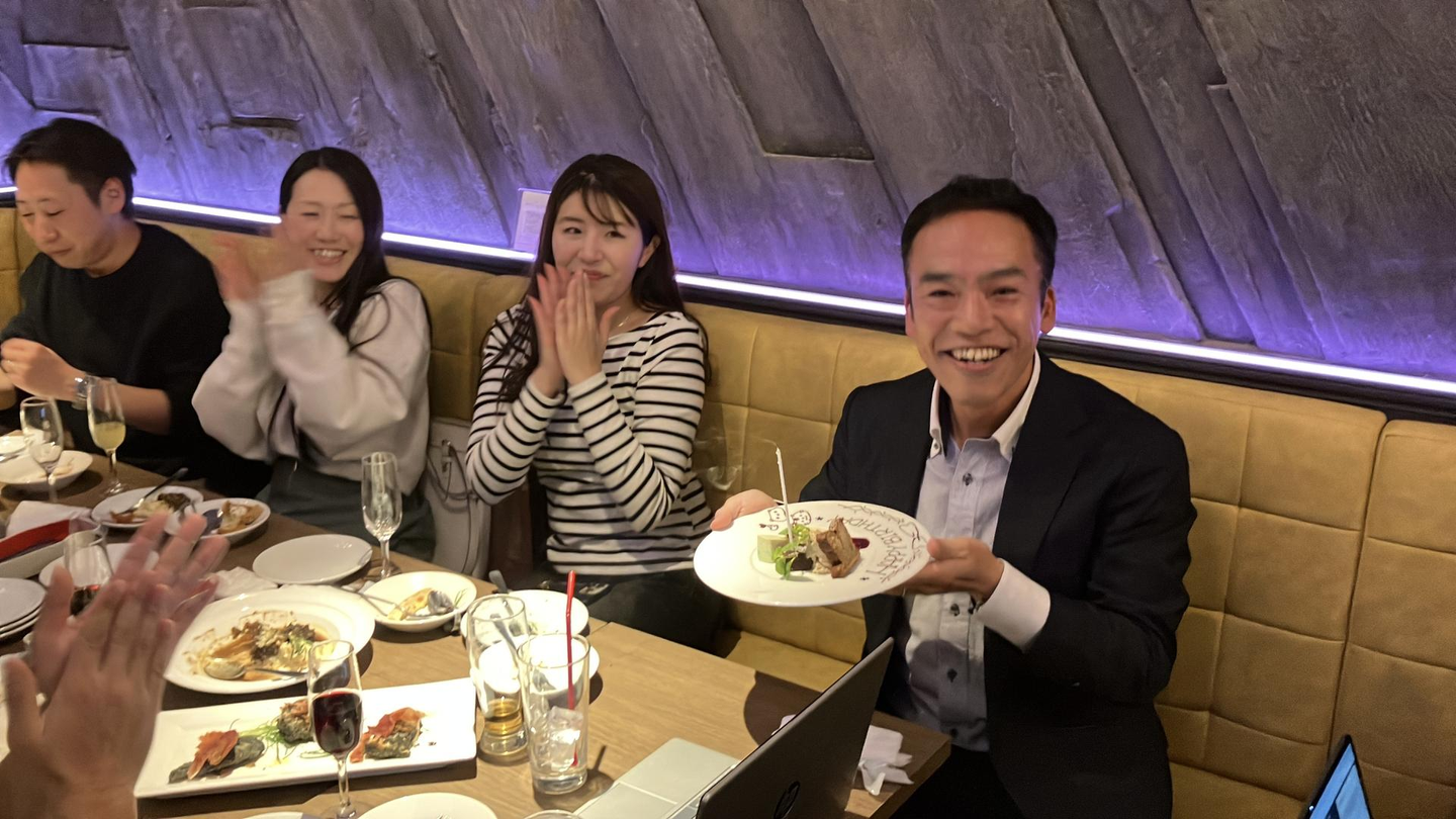 それから、代表へのバースデーサプライズプレートが登場し、全員で記念撮影を行いこのタイミングでオンライン組は任意退出となりました。 3時間は長いかな?と思いましたがあっという間にお開きに。 2025年もこうして楽しく集まれるよう、「もっと幸せに」なるようにアフェックスは走り続けていきたいと思います。そして景品も「もっと高いもの!」になることを願って(笑)