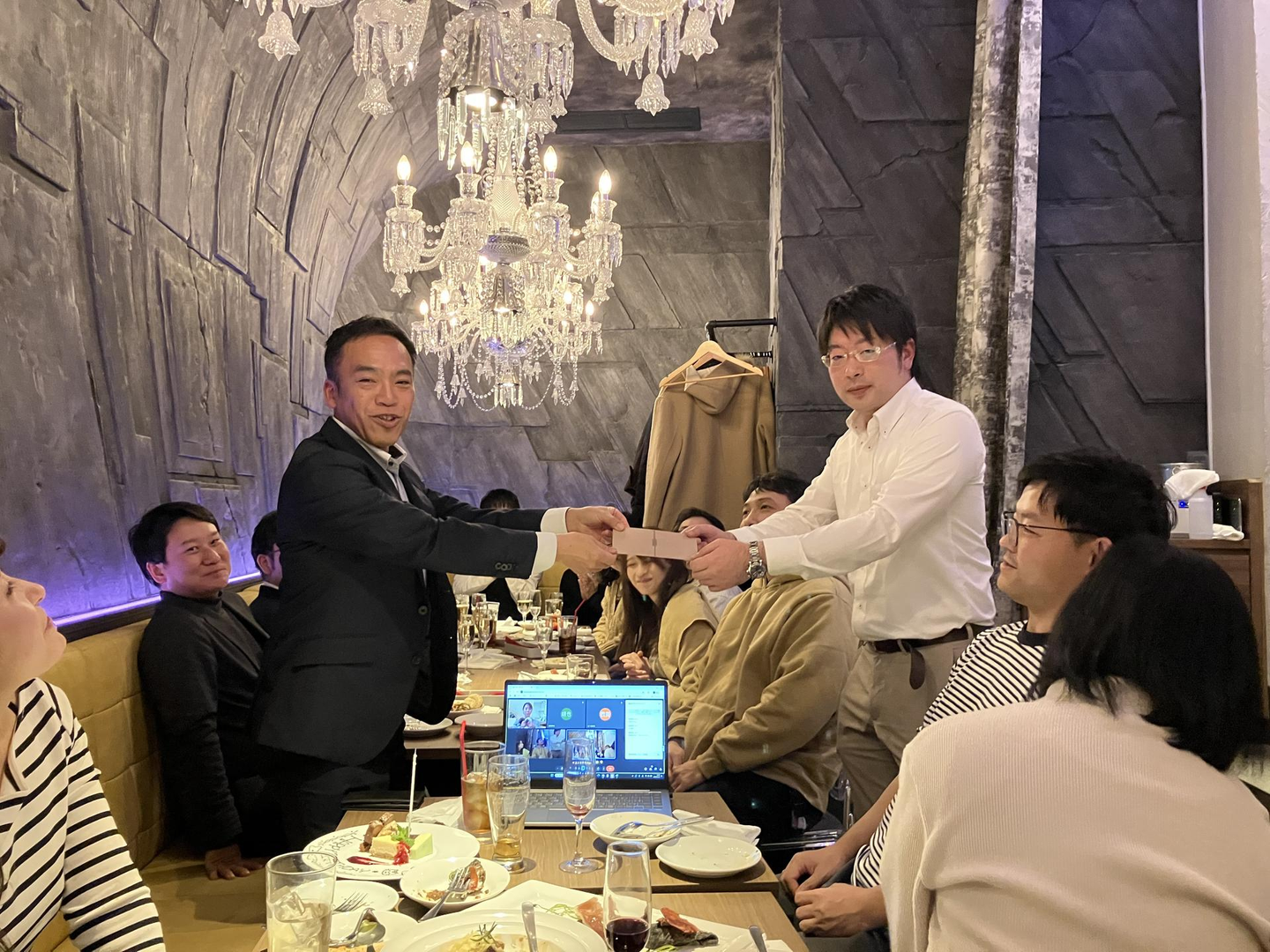 当日は19:30スタート。 オンラインメンバーの参加も確認し「今年も一年お疲れ様でした」と代表の乾杯でスタートしました。 最近のお店は注文がQRコードなので営業のOさんが飲み物の確認に動いてくれていました。お客様との忘年会が被ってしまったメンバーも20:00過ぎには合流出来ましたので、お待ちかねの景品クイズ大会です!