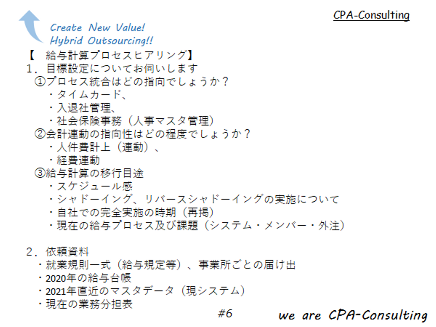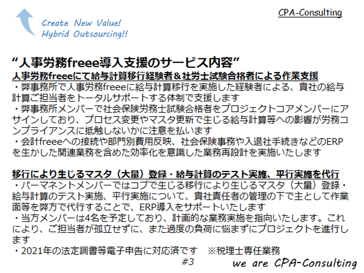 ・弊事務所メンバーで社会保険労務士試験合格者をプロジェクトコアメンバーにアサインしており、プロセス変更やマスタ更新で生じる給与計算等への影響が労務コンプライアンスに抵触しないかに注意を払います