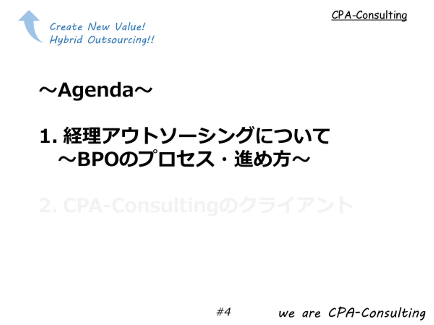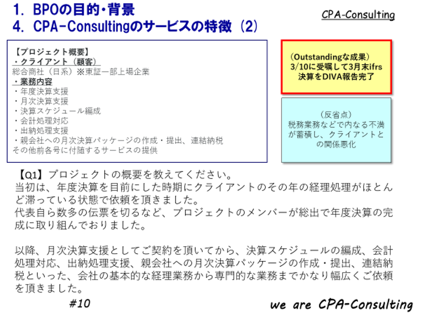 - CPA-Consultingのアウトソーシングの特徴 当社のBPOはプロジェクト管理と業務の双方の難易度が高い