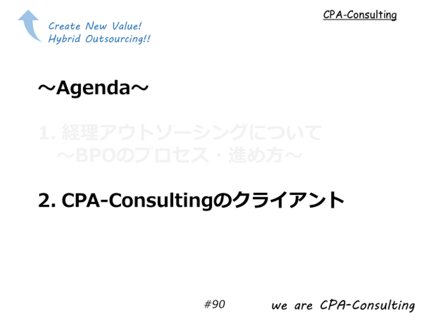 BPOに求められる専門業務(金融商品取引法領域、税効果会計や税務ISSUE、プロジェクトマネジメント、システム導入・移行プロジェクト等)で高度な成果、達成 - CPA-Consultingの「Hybrid Outsourcing」のコンセプトは、BPOの安定運用を前提とした、多様なニーズに対応するもの ①大手BPOベンダーが対応しない1人工からの規模にリーチ