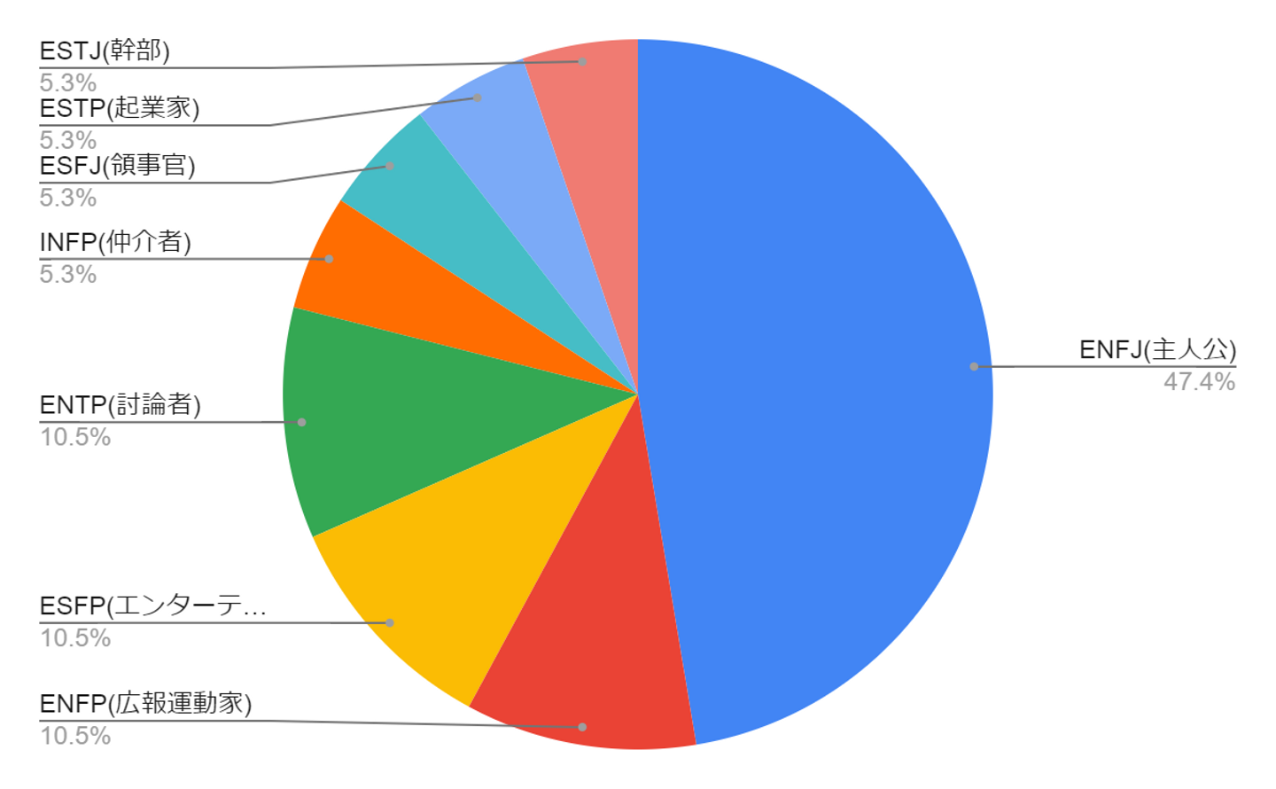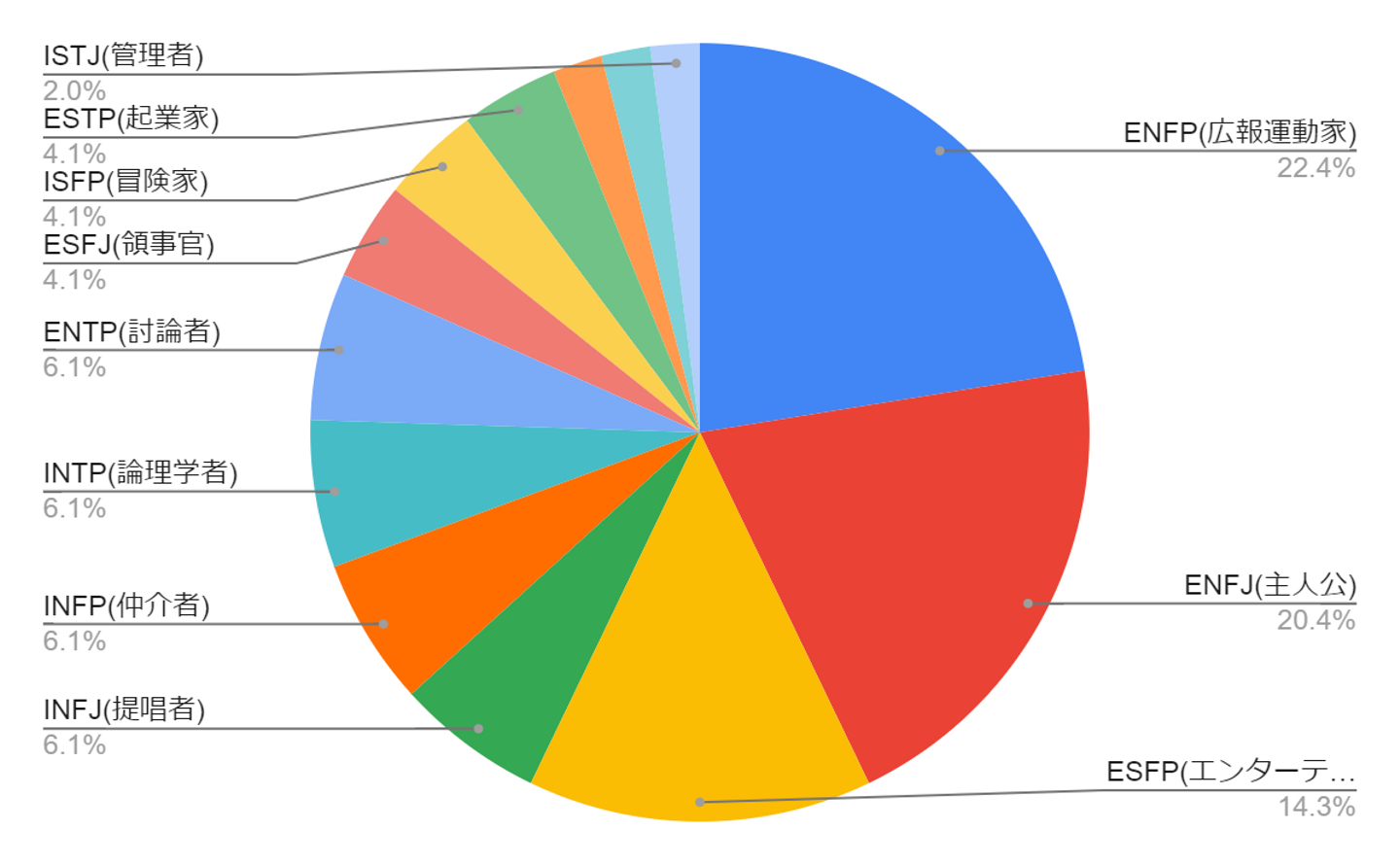 どの結果を見ても、「ENFJ(主人公)」と「ENFP(広報運動家)」が圧倒的に多いことがわかります!