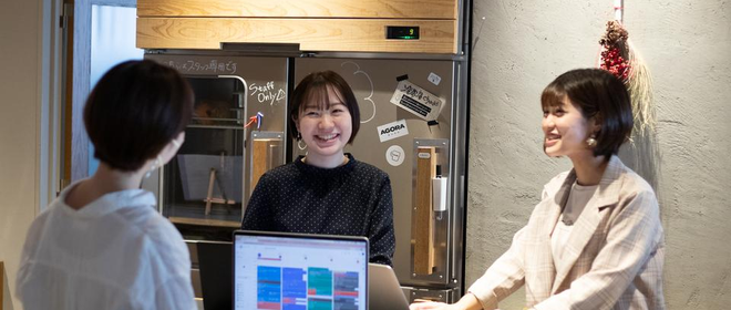 私たちの運営するコワーキングオフィスBUSO AGORAでは、現在女性スタッフ4名が活躍中!利用者さんとのコミュニケーションももちろん大事ですが、一番はスタッフ間のコミュニケーションを大事にしています。利用者さんのこと、施設のこと、改善したいこと、逆に良かったことなど、細かに情報共有を行い、いつでもだれでもいい状態で運営できるようにすることを大切にしています。中には、配属されてから1ヶ月のスタッフもいますが、コミュニケーションが頻繁にあるためすでに溶け込み、一緒に頑張ってくれています!一方でメリハリもしっかりあるので、仕事はしっかり責任もって!企画・PR・改善推進・経理業務など、それぞれ...