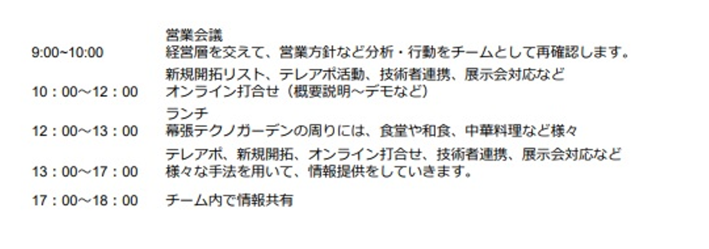 そうです、かけないのです!!ご紹介したいのですが、ジャンガでは開発もアジャイル方式を採用し、営業も設定した数値に向けて業務の流れは基本的に任されています。特徴として、コミュニケーションをよくとる会社です。なので営業も開発もテレワーク中、お客様や社内とChatでやり取り、展示会参加中もオンライン会議など多種多様な方法でコミュニケーションをとっています。