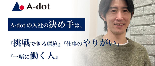 常に創造と挑戦で溢れる会社を目指しています。 ビジネスを通して、一人ひとりが輝き社会に貢献していく、そんな想いから生まれたの株式会社A-dotです。 A-dotに関わるすべての人を幸せにできるようにありたい。 誰しもが持っている可能性に一緒にチャレンジして、日本を盛り上げませんか。 弊社は人材サービス(SES)、受託開発、コンサル、ファイナンスの事業を行っています。 多様な取り組みと楽しみながら成長できる環境をつくっています。 ぜひ、一緒に最高の会社作りをしましょう!!