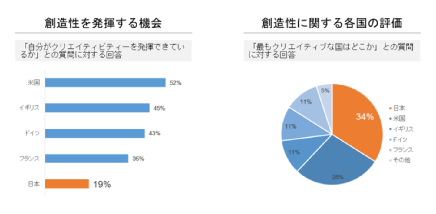 こうした職種の方々一人一人が、素晴らしいアイディアや現場ならではの気づき・改善案などを会社全体に発信し、会社としての企業価値の向上・企業の圧倒的な成長に直接的に貢献できるポテンシャルを秘めているものの、現在の上記のような社会構造においては、なかなか自身のアイデアや改善策をアウトプットする機会が少ないのが現状です。実際、日本の労働者は世界の中でもクリエイティブな業務をしているイメージが34%もあることとは裏腹に(下記右図)、業務において自分の創造性を活かしていると回答しているこうした日本の労働者の割合は、他国に比べ圧倒的に低いというデータもあります。(下記左図)