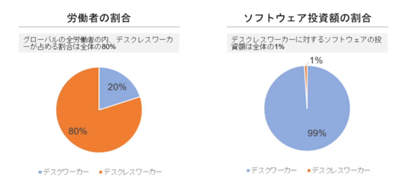 しかし一方、私たちの日本経済の大部分を根本的に支えているデスクレスワーカーという職種の現場では、DX化・デジタル化はまだまだ進んでおらず、ITの恩恵を十分に受け手られていないことが社会背景として存在しています。実際、こうしたデスクレスワーカー全体の労働者の80%と大きな割合を占める現在の労働市場においてのIT投資は、1%なのです。