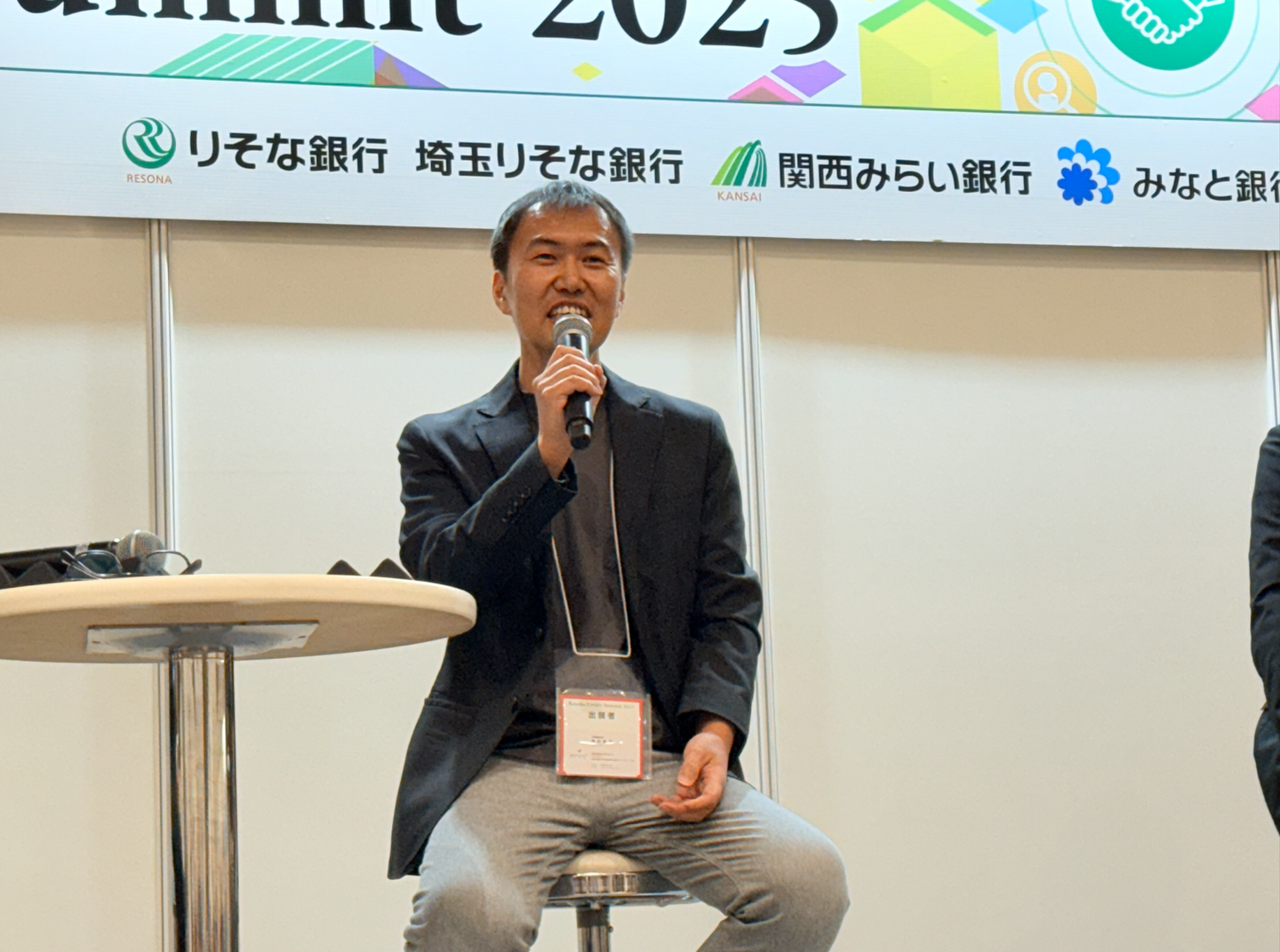 大阪林業株式会社 代表取締役社長 片岡 秀介様、アンドット株式会社 代表 茨木 雄太様 とともに登壇し、ファシリテーターとして株式会社りそな銀行 法人・プレミア戦略部 小西 繁樹様 に進行いただきました。