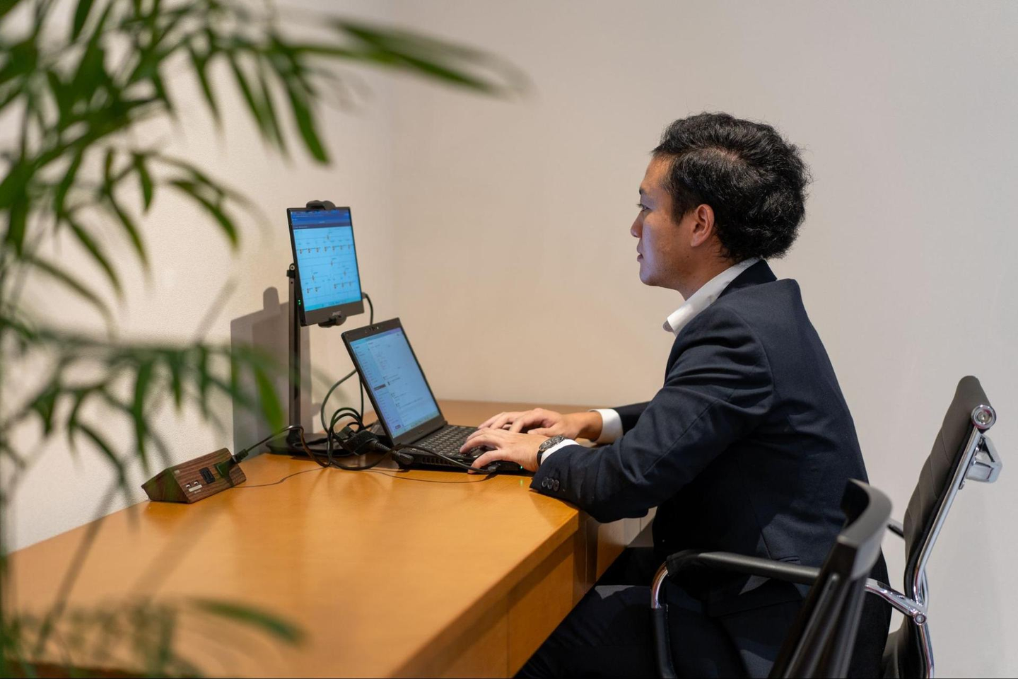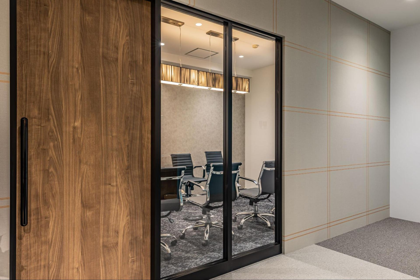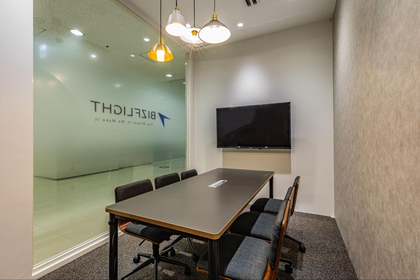 様々なお客様をお迎えする会議室は、6人席と8人席の全2部屋です。照明にもこだわっていて、落ち着きがあり、解放感もある会議室なんです。大画面のTVも設置していますので、パソコンの画面を投影しながらの会議もできます。