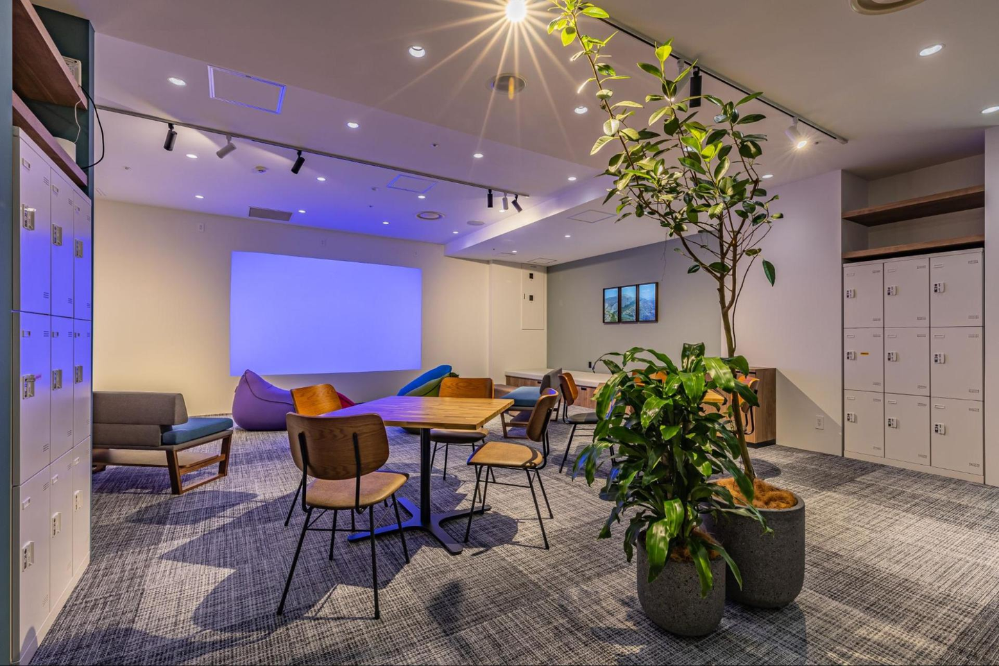 コンセプトでも説明しましたこちらは、多目的に使用できる交流の場です。大画面のスクリーンがあり、セミナーやイベントなど様々な目的で活用できるんです。