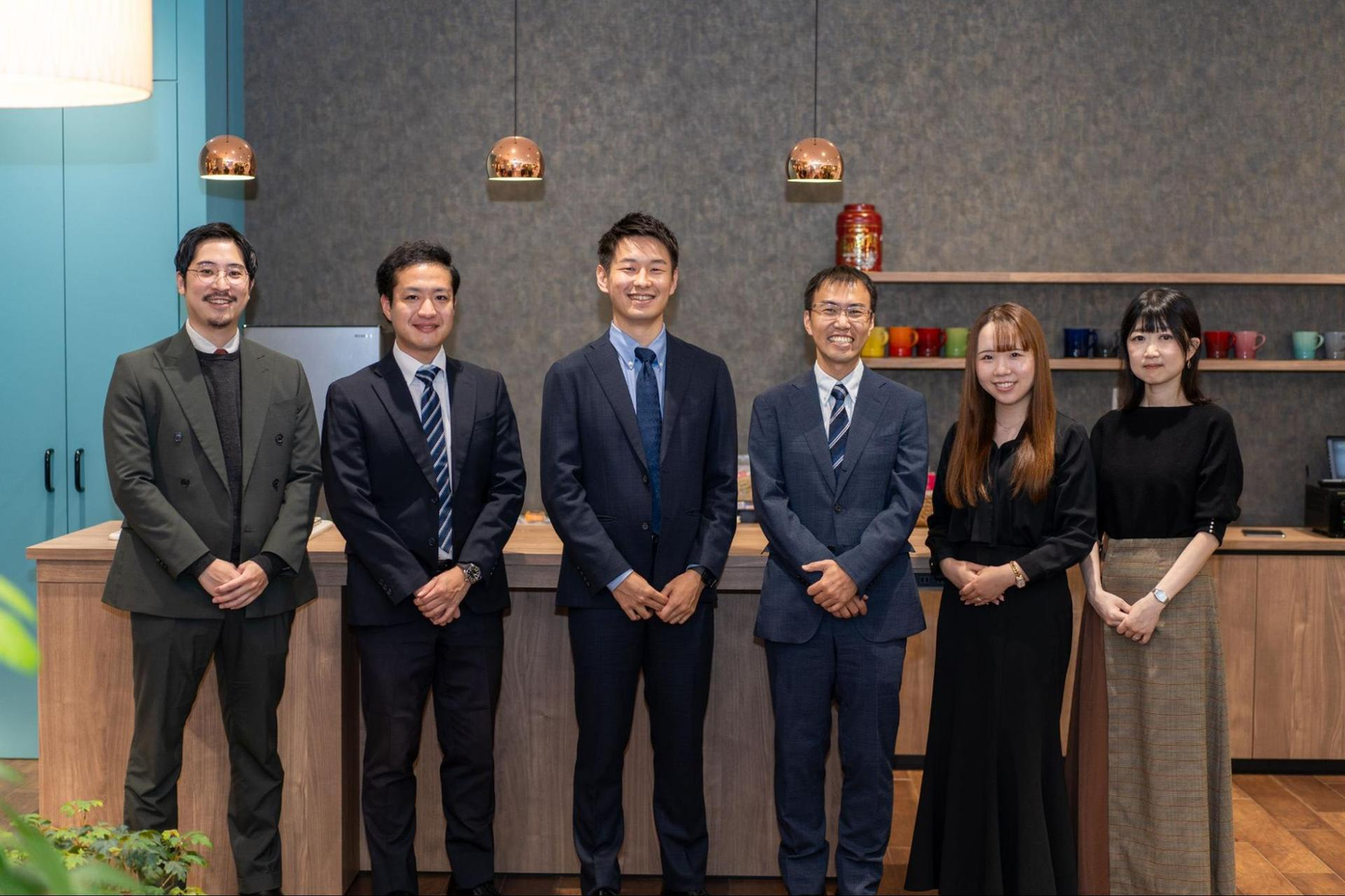 入ってまず目にするのは、長いカウンターテーブル。ここは、仕事がひと段落ついたときに、みんなが気軽に話ができる場所です。緑もあって、とても落ち着きますよ。