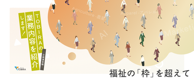 「働きたい」と願う人が、環境や仕組みの欠如によって選択肢を奪われてしまう。そんな理不尽な現実を変えるために、私たちは存在しています。合同会社TOBIRAは、障害福祉サービス「就労継続支援A型」を軸に、EC・クリエイティブ・農業・物流と多角的なビジネスを展開しています。私たちの役割は、支援に留まらず、利用者が市場で勝ち抜けるプロのスキルを磨き、圧倒的な自信を持って次のステージへ羽ばたくための「通過点(トビラ)」を創ること。一人ひとりが「必要とされる場所」を見つけ、自分らしく前向きに生きられる未来を創ります。