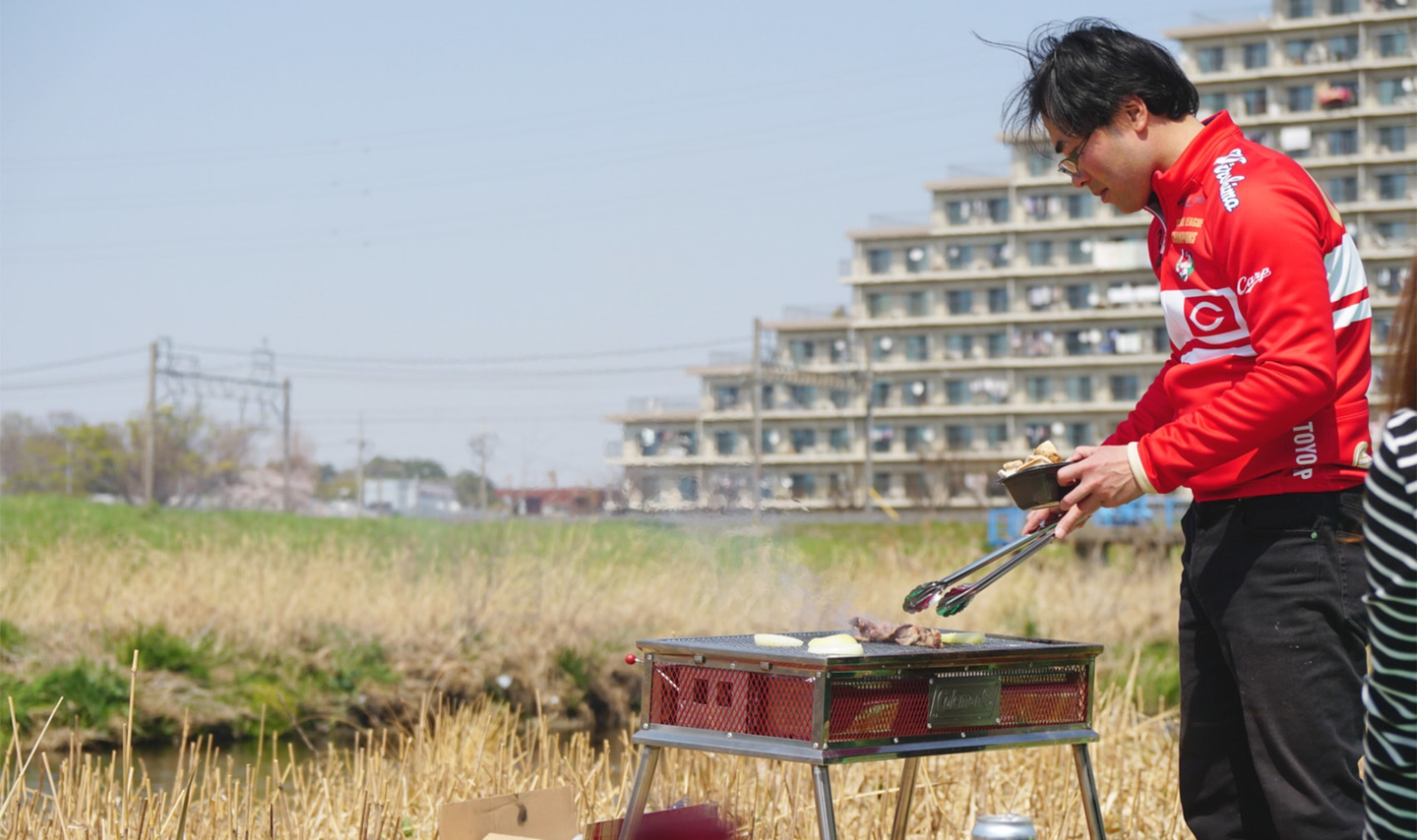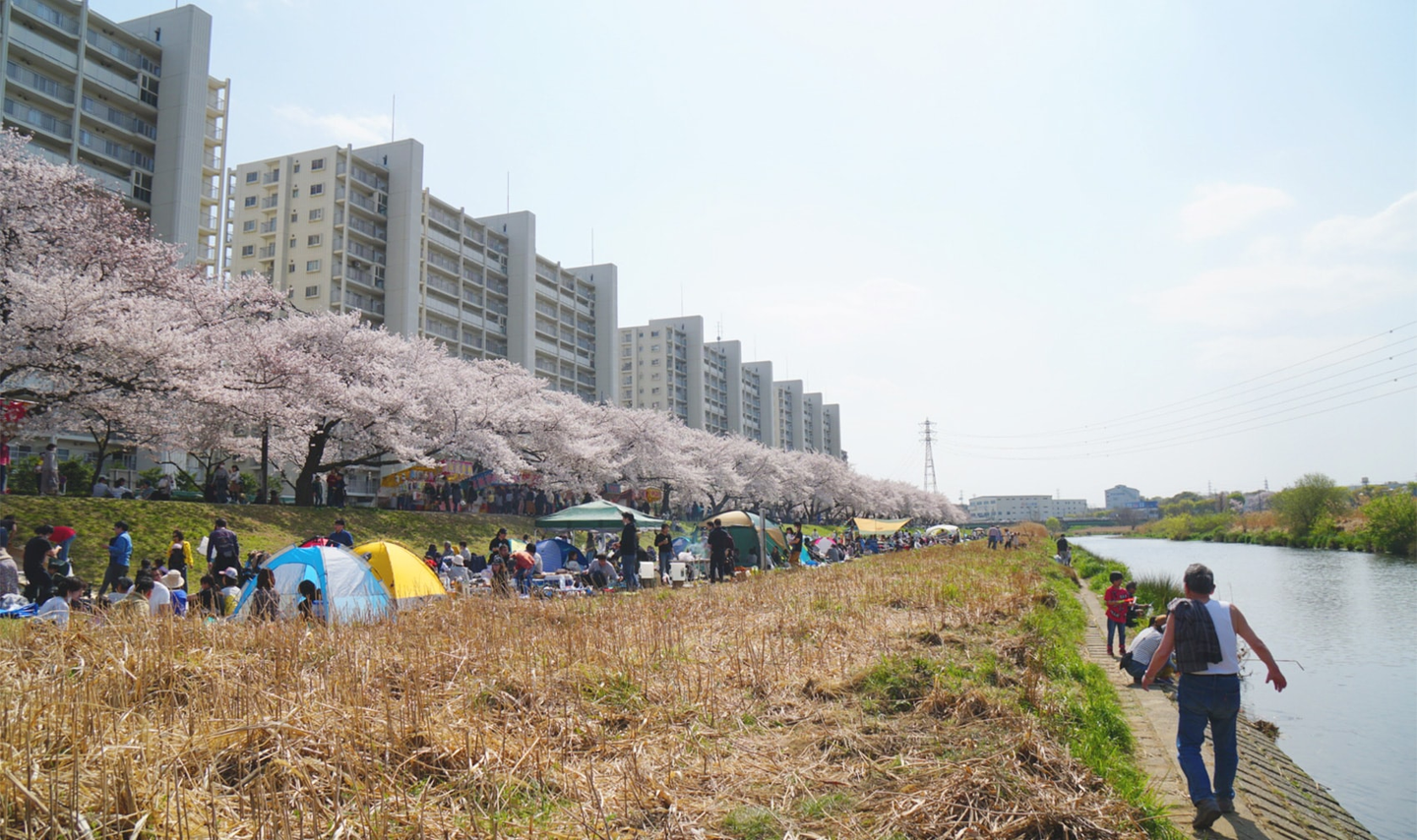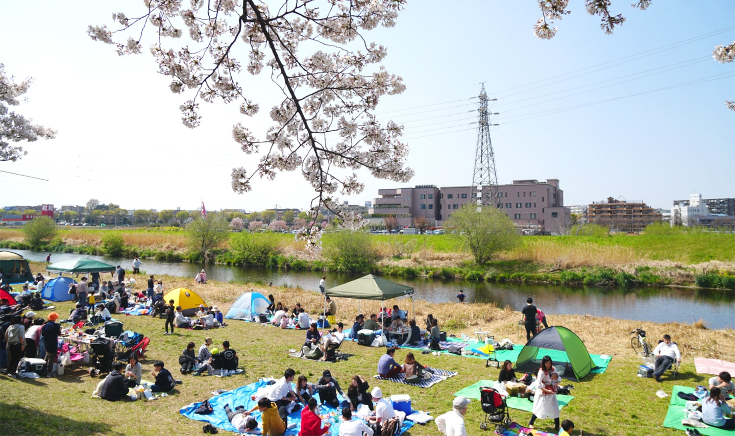 お花見会場は埼玉県柳瀬川。近くにスーパーあり、露店あり、BBQ可の最高スポットです〜。