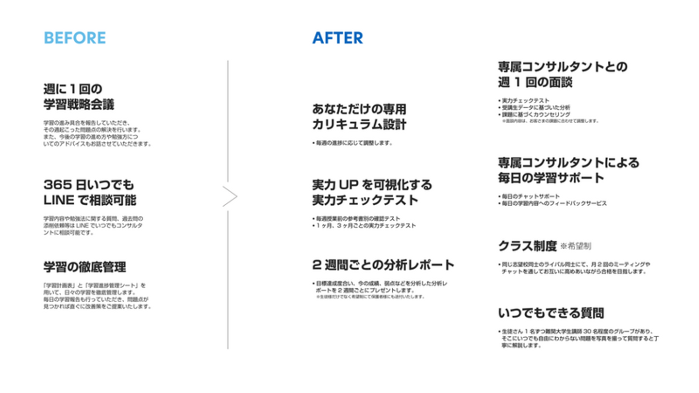 サービス内容についてですが、戦略などここでは書けないものがほとんどなのですが、他のコーチング塾(武田塾やマナビズムなど)では解決できていない課題を解決することでより合格にコミットするサービスを提供したいという想いからリニューアルを行いました。