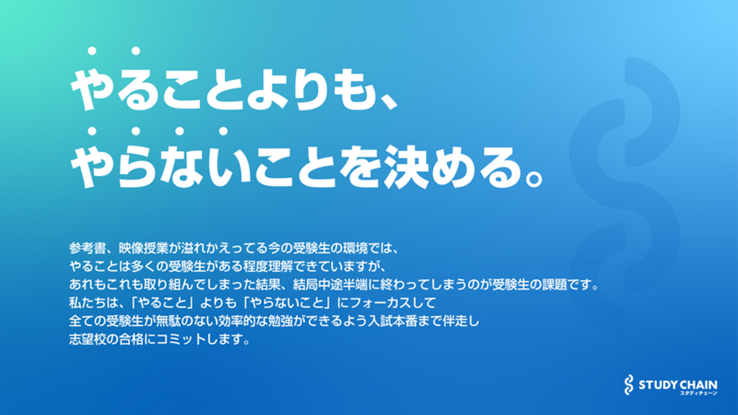 今回のリブランディング(ロゴ、スローガン、サービス内容)を通して、スタディチェーンは、日本全国の受験生と「やることよりもやらないことを決める」伴走を通して、志望校の合格にコミットする、そんなブランドをより浸透させてまいります。