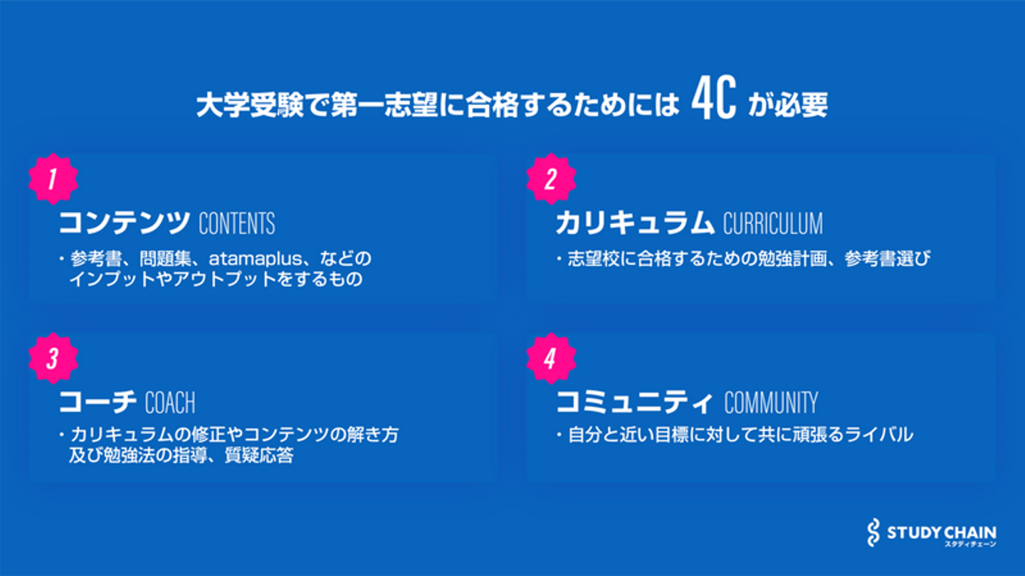 スタディチェーンとは、授業をしない塾であり、勉強のやり方を指導し、毎日の勉強の進捗を徹底管理する受験勉強版ライザップです。サービス名としては、大学受験コーチング「スタディチェーン」となります。