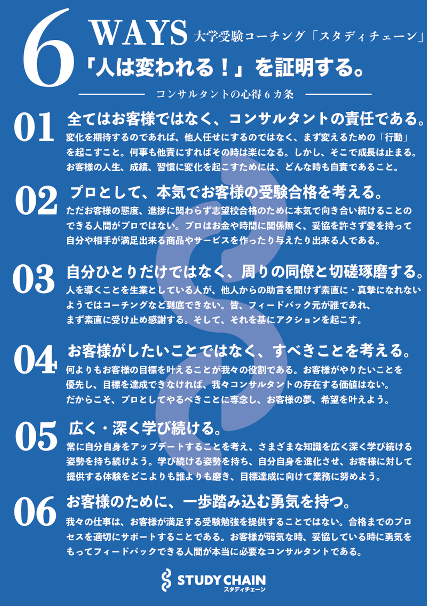 スタディチェーンだからできることをやろう。スタディチェーンでしかできないことをやろう。それに伴って戦略やブランディングも変更致しましたが、同時に生徒とともに伴走するコンサルタントのバリューを設定しました。