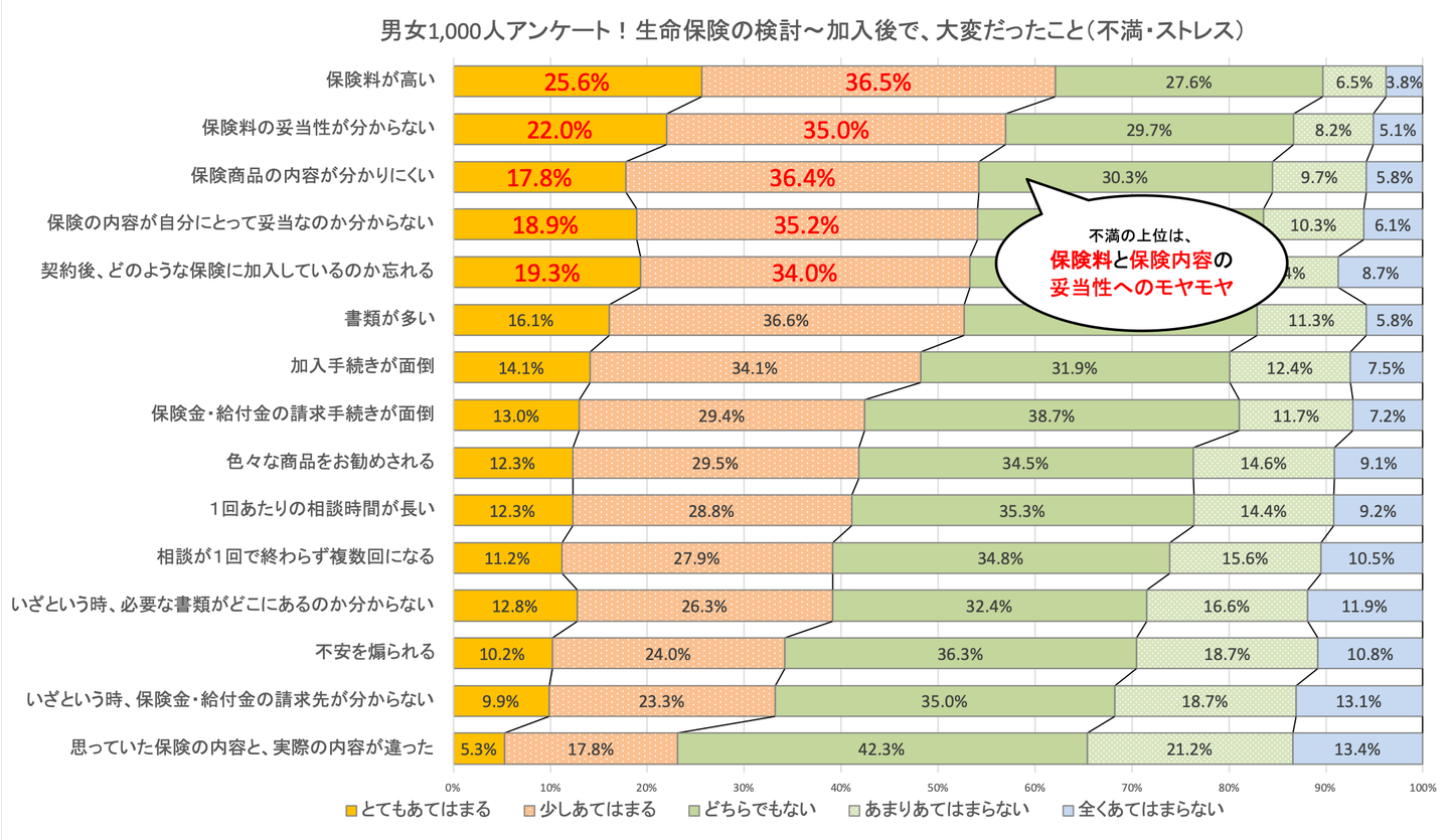 以下は、生命保険の検討〜加入後で大変だったことを調査したアンケート結果です。