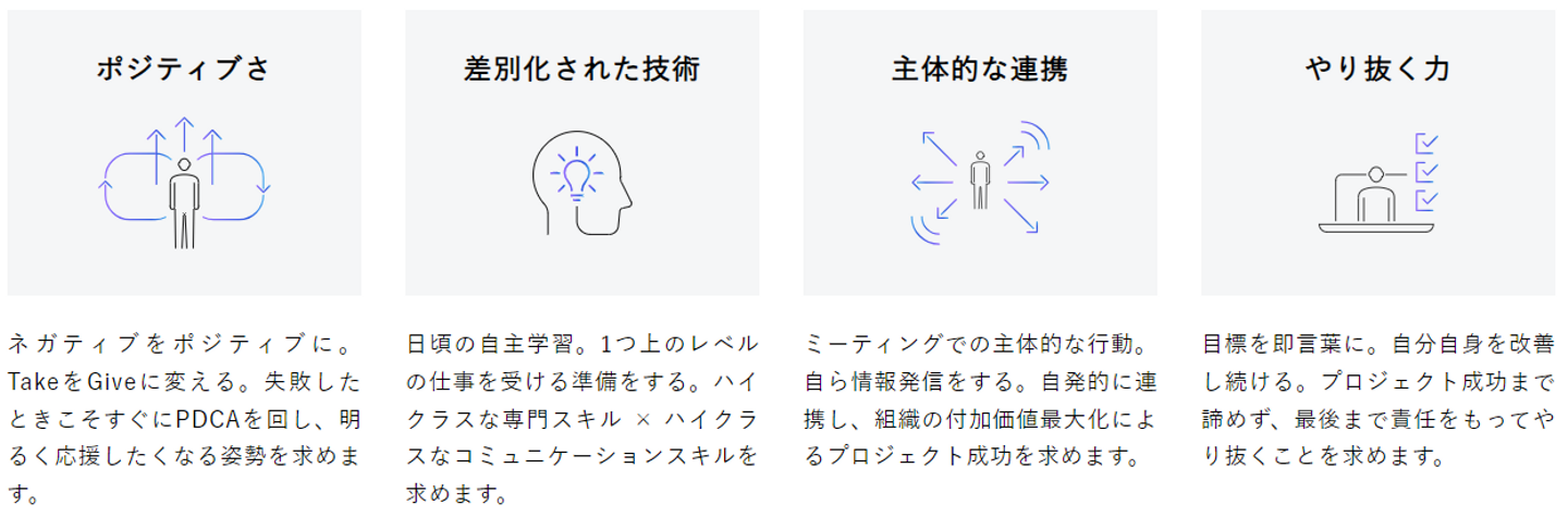 No.Valueでは、ポジティブさ、差別化された技術、主体的な連携、やり抜く力の4つを、