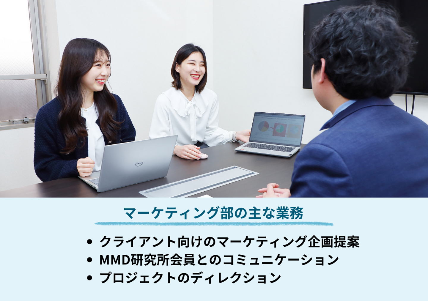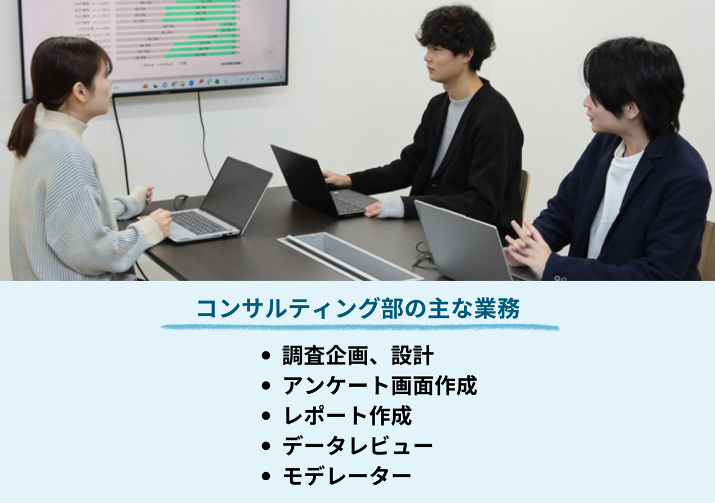 コンサルティング部はMMDLaboの武器である調査のプロとして、クライアントの課題に寄り添った調査設計から、打ち手の提案を含むレポーティングやデータレビューまで、その根幹を担う部署です。