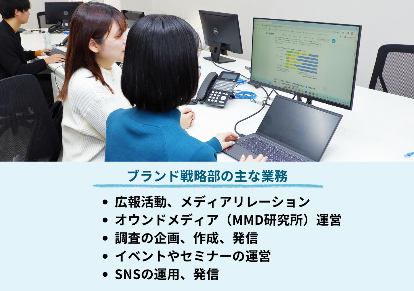 ブランド戦略部は、MMDLaboの広報・PRを担っており、メディアの皆様とのコミュニケーションはもちろん、オウンドメディアであるMMD研究所の運営やSNSの運用を行っています。MMD研究所で公開している通信・端末・決済・トレンドのサービスなどをテーマにした自主調査の企画から発信、各種メディアへの持ち込みまでも一貫して担当し、MMDLaboのブランディングを行っています。