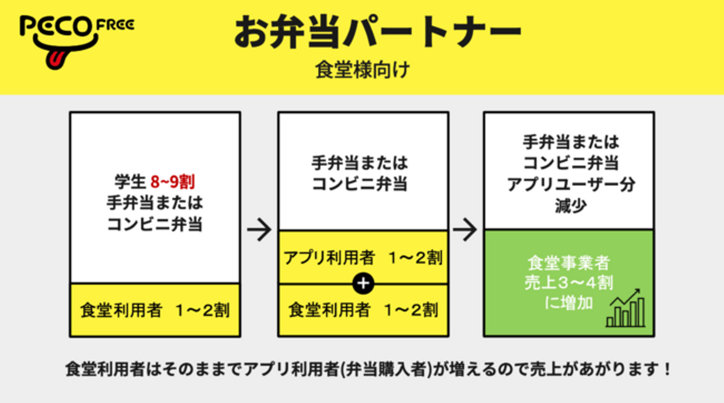 お弁当製造会社、食堂運営会社様へPECOFREEを導入していただくことにより、アプリでの受注、キャッシュレス対応が可能となります。導入費は¥0、複雑なシステム管理は一切不要。またお弁当の個数予約を前日に分かることでフードロスを防ぎ、お弁当事業者・食堂または購買部の収益を大幅に上げることが可能です。