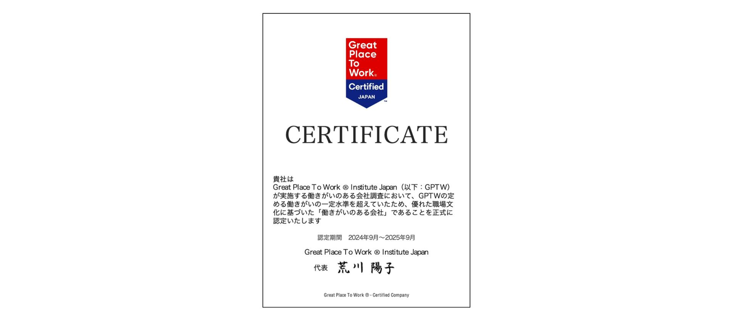 専門性を高める研修や能力開発の機会が多く福利厚生が充実しており、これらが従業のモチベーションアップに繋がっているという点が今回の結果につながり、創業7年目のまだまだ新興ではありますが「働きがいのある会社」として2年連続で認定を受けることができました。