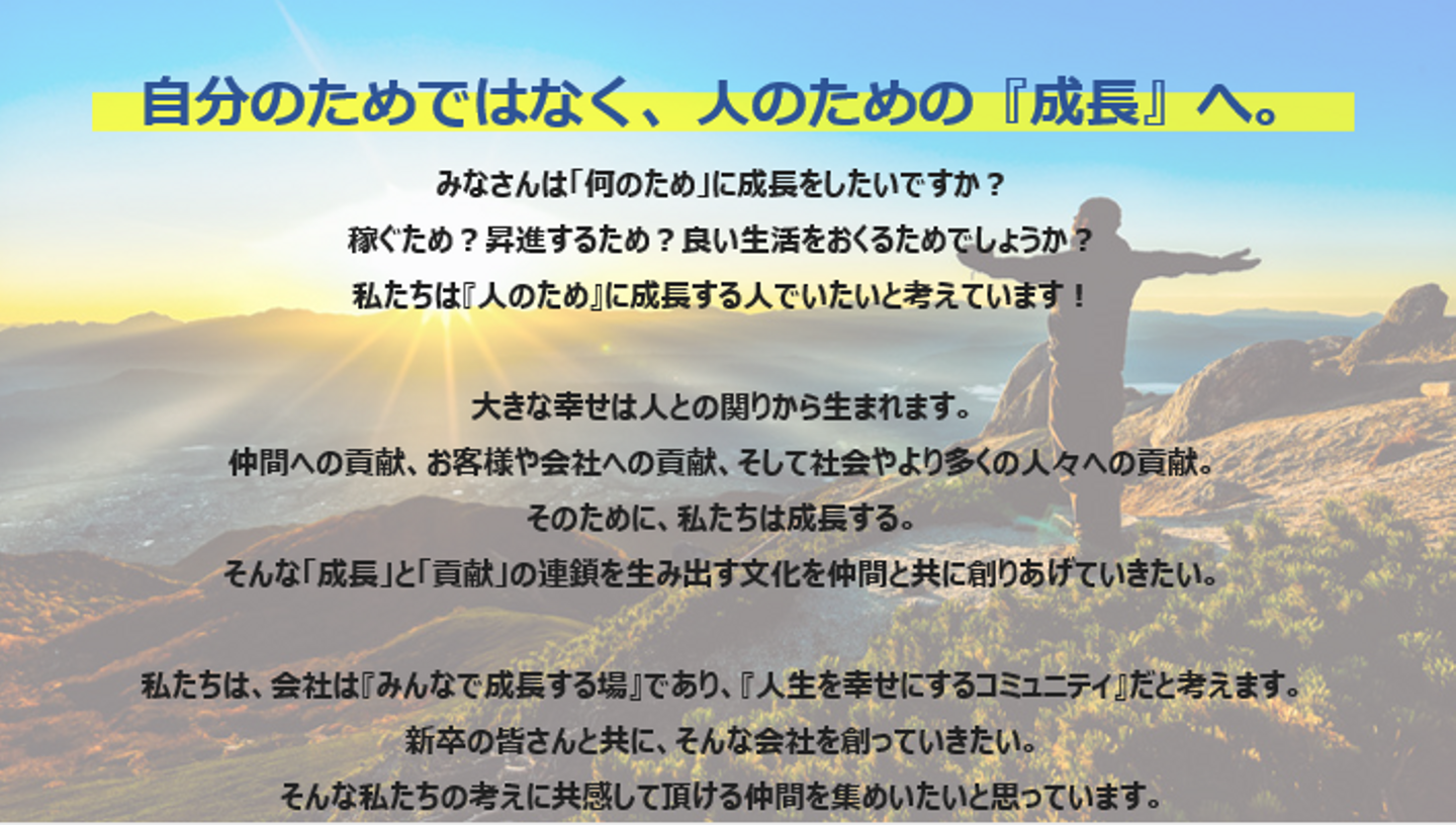 自分が成長し、仲間を成長させ、会社・顧客を成長させる。好影響の連鎖を生み出して、みんなでそんな感動を共有したい。「成長」と「好影響を波及」させる文化を仲間たちと創りあげていきたい。