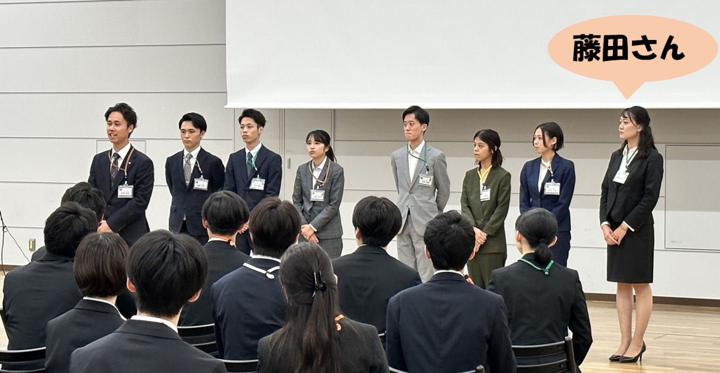 イベント最後に、今回参加した企業に内定が決まった先輩方が登壇し、激励のメッセージを送りました。あれ...?藤田さんがいる....?