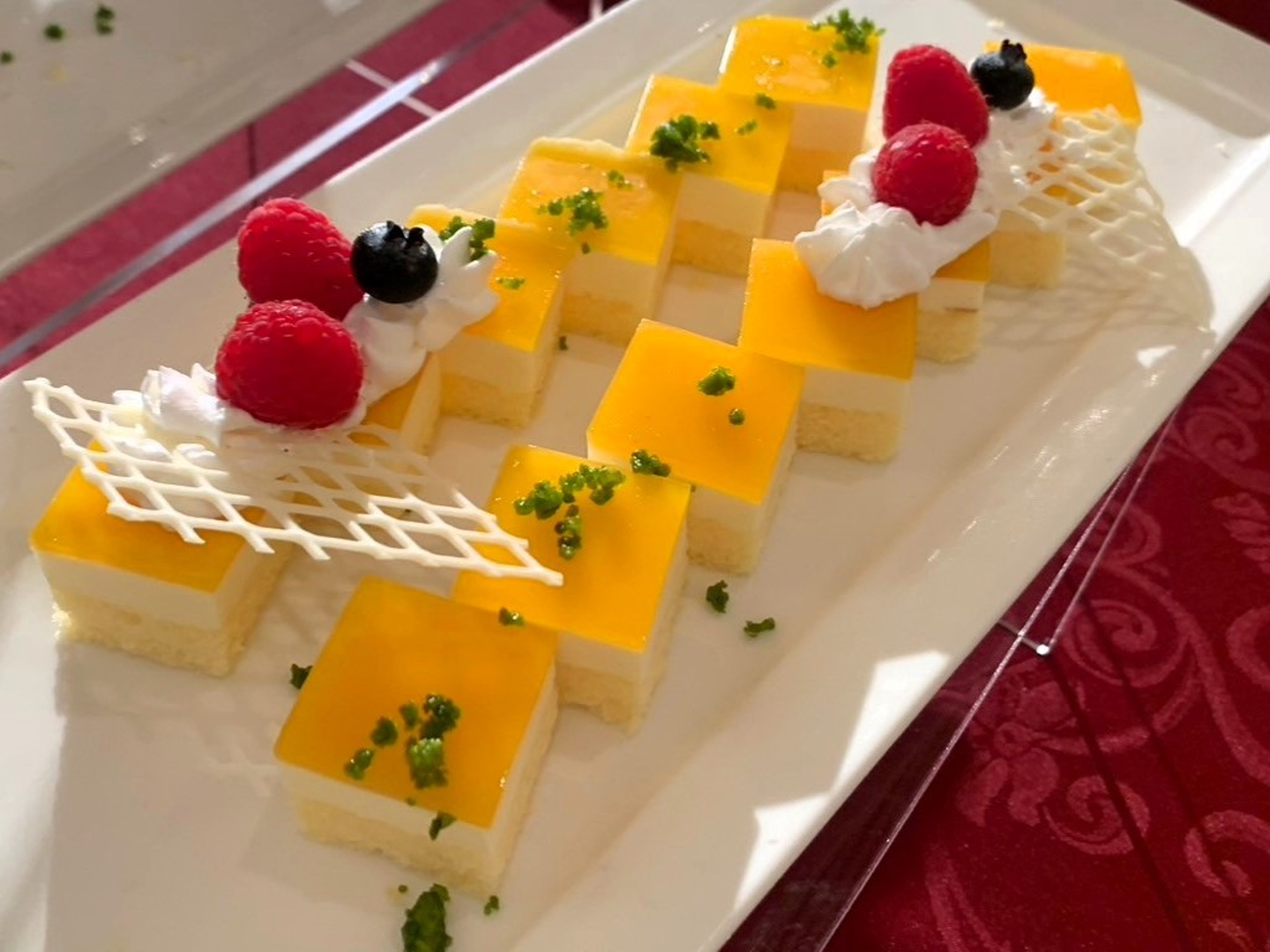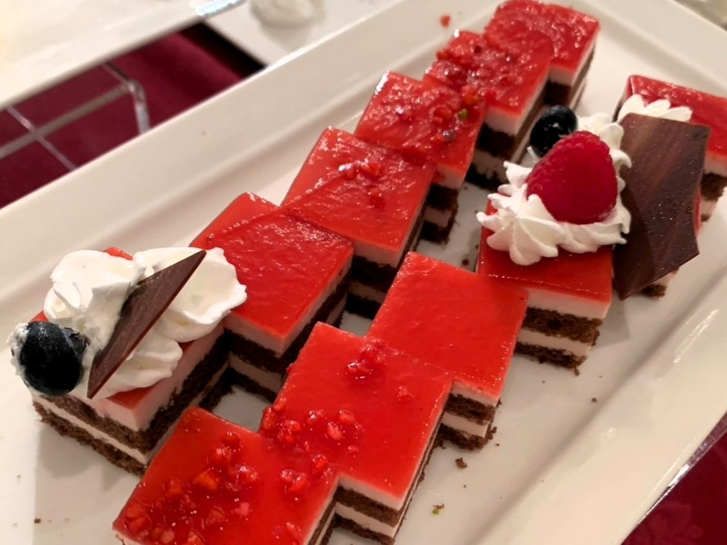 終盤には、様々なデザートとコーヒーが用意されました🍰☕ オレンジやベリー系、抹茶など、色とりどりなケーキに迷いながら、最終的には全種類取ってしまっていました🤤