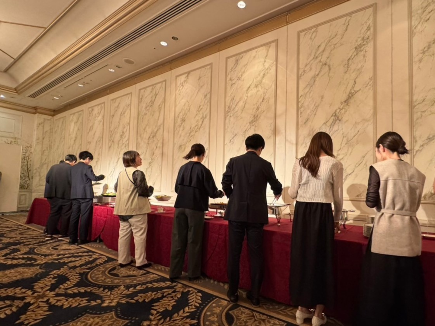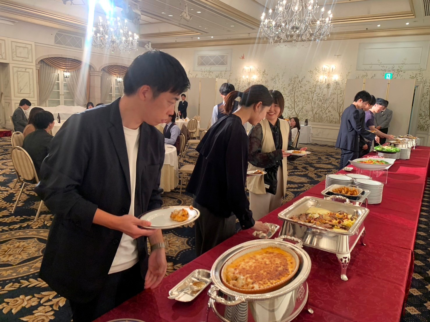 乾杯が終わり、早速ぞろぞろと並び始めます🚶 どんなお料理があるのかとみんなワクワク🤤